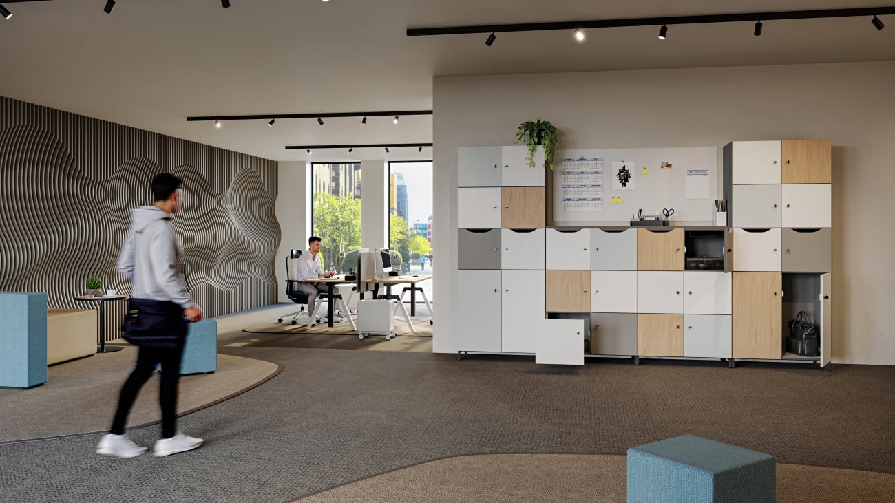 Ein Büro ohne feste Arbeitsplätze sollte über eine andere Infrastruktur und ein eigenes Konzept verfügen. Die Zonierung spielt hier eine wichtigere Rolle: Wo kommen die Mitarbeitenden an? Was tun sie als erstes? Eine Möglichkeit zum Verstauen der persönlichen Dinge wie das ACTA.PLUS Locker System sorgt dafür, dass sie mit dem guten Gefühl, alles sicher verwahrt zu wissen, in den Tag starten.