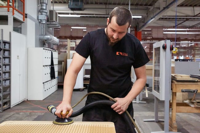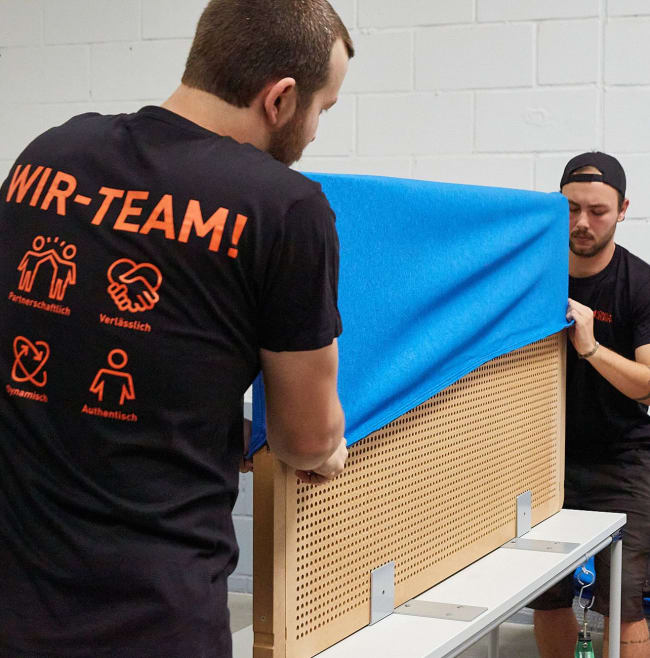 Wir übernahmen die vorhandenen Paneele und führten eine umfassende Prüfung ihrer Substanz durch. Durch neue Tischmaße mussten die Paneele verbreitert werden. Hierfür entwickelte König + Neurath passgenaue Holzergänzungen, die mit handwerklichem Knowhow und großer Sorgfalt montiert wurden. Anschließend fertigten wir maßgeschneiderte Stoffbezüge nach den neuen Größen und Farbkonzept unseres Kunden. Nicht mehr erneuerbare Tischpaneele wurden durch neue INSIDE.50-Paneele aus unserem Portfolio ergänzt. Die alten Stoffhüllen und unbrauchbare Paneele haben wir dem Recycling zugeführt.