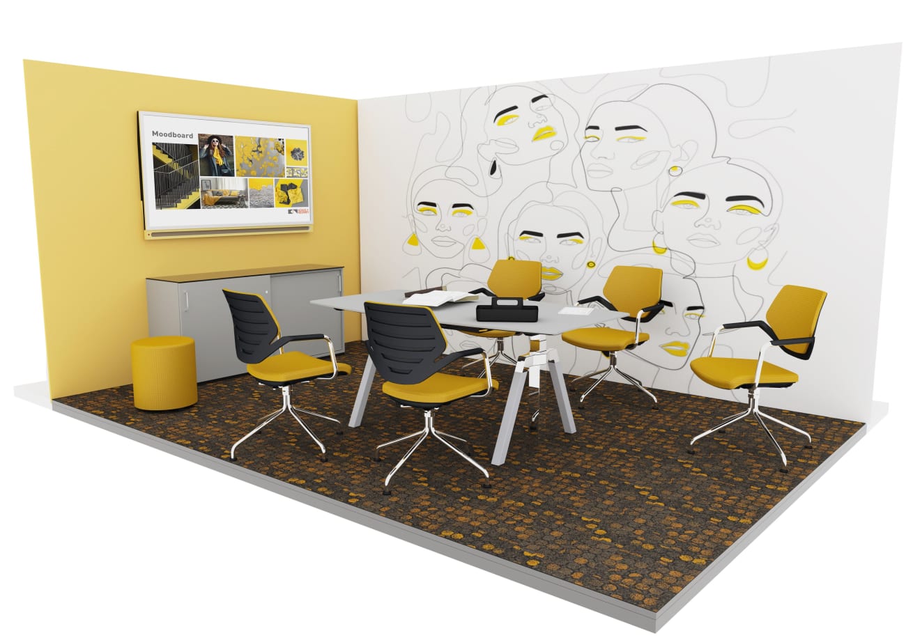 Carina Hölzer describes a meeting room designed around the Pantone colours as an embodiment of “timeless elegance and joyful synergy”. The combination of yellow, grey and chrome conveys a classy, friendly and neutral vibe. Nothing is so dominant that it distracts from the essential focus. The wall, which in this scenario features a facial art design, has echoes of Surrealist artists like Matisse and Picasso whilst at the same time inspiring creativity. Our new K+N NOOK conference chairs, shown here in yellow and chrome, are shaped to give a light, clear impression.