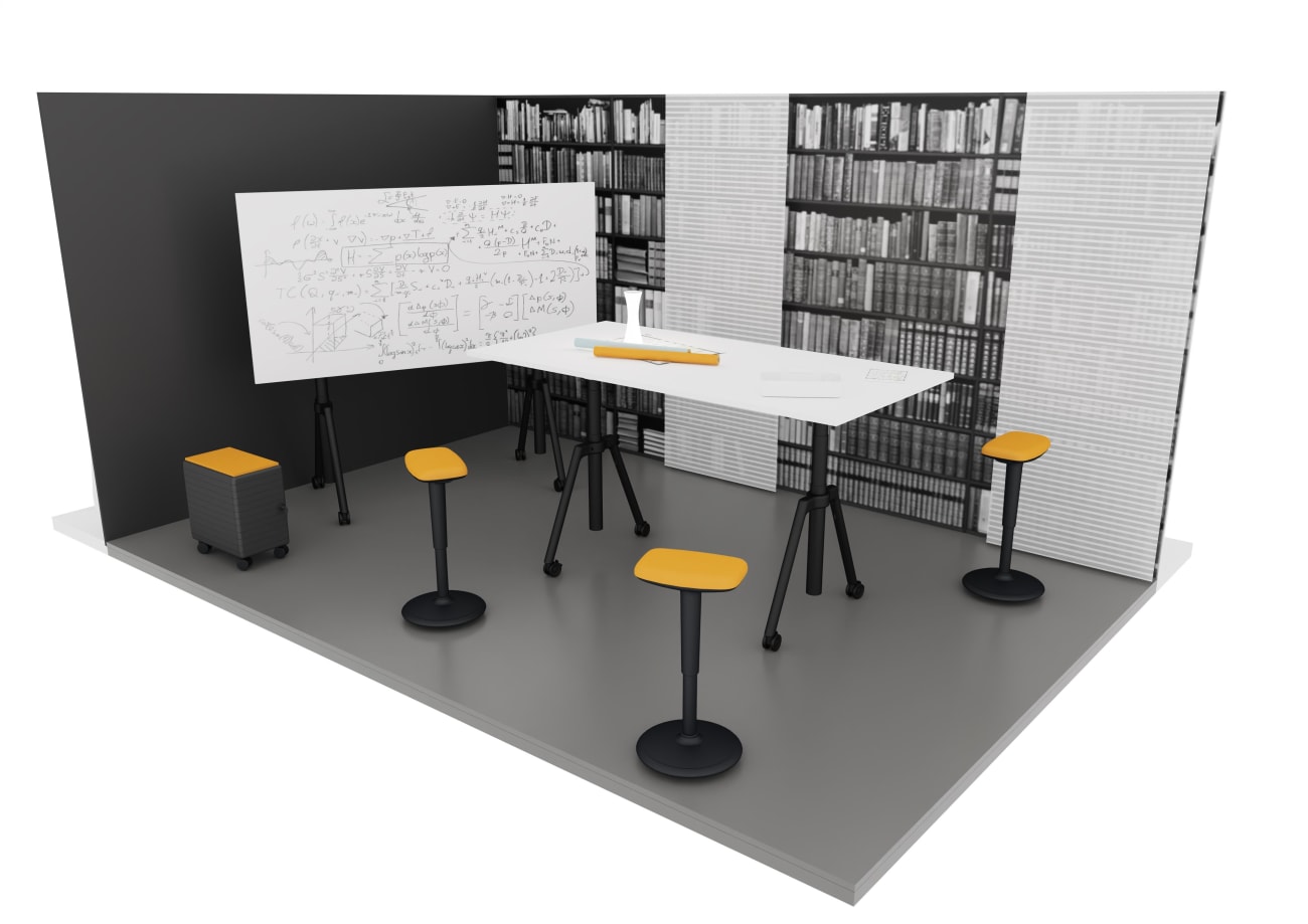 “Cheerful communication in grey and yellow” is the principle for Carina Hölzer, when she’s designing a meeting zone in the Pantone colours. The idea is for the colour to support focused working and provide clarity to encourage a logical exchange of ideas. In this context the colour yellow dictates the theme of sitting and standing, embodied by our sit-stand support QUICK.III. The photo wall in the form of a stylised bookshelf is a subtle visualisation of knowledge transfer, while the acoustic textile panelling – used here as a sliding unit – lends the requisite homely feel.