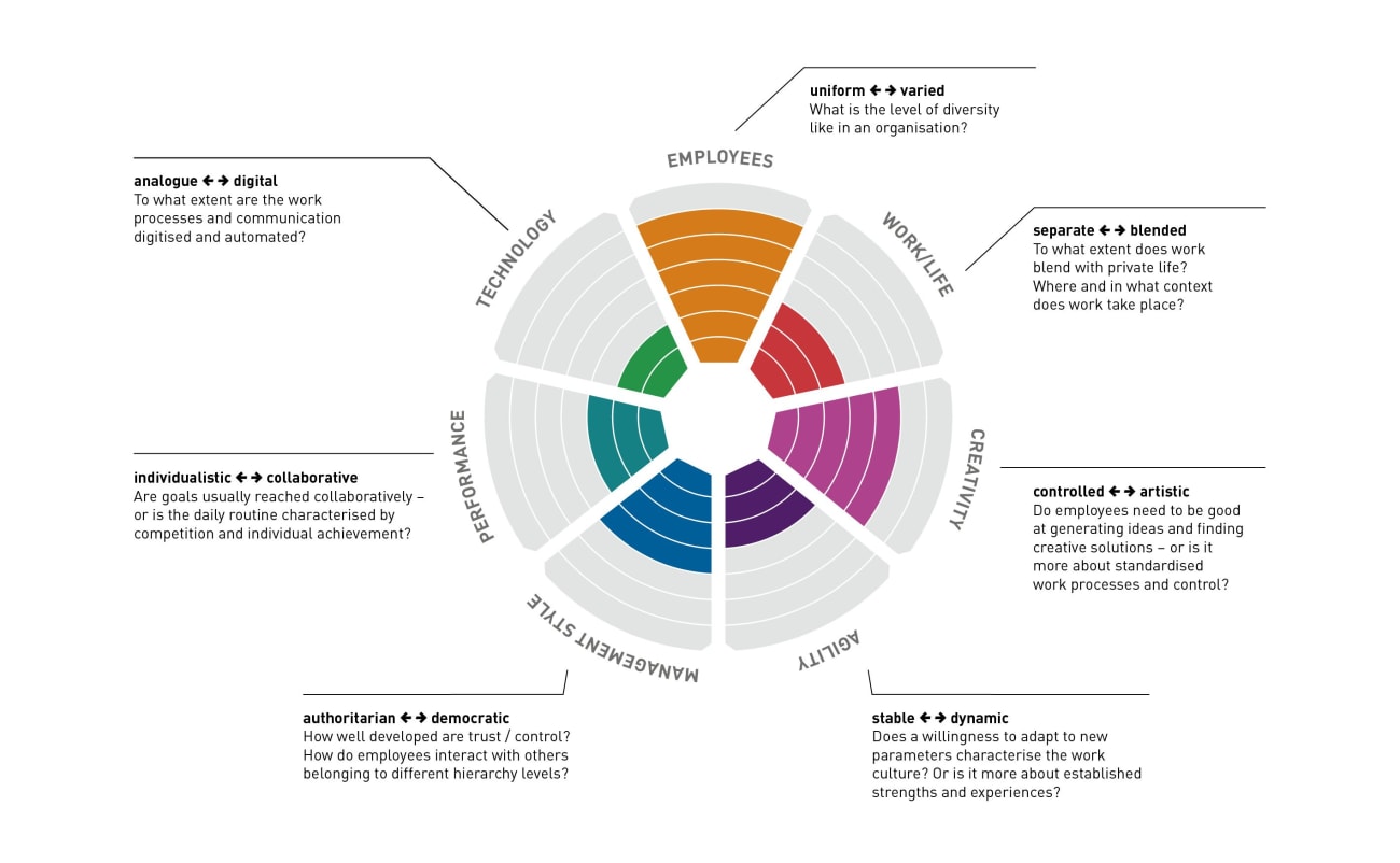 Every company is characterised by its own specific work culture. König + Neurath has developed an analysis tool to find out the qualities of this individual culture: with the help of the K+N WORK.CULTURE.MAP you can discover your company’s status quo across seven dimensions – technology, management style, employee structure, work-life, creativity, performance and agility. On the basis of the information gathered, we visualise your work culture and transform the results into inspiration for designing your working environments. With deeper analysis and workshops we can then collaborate with you to develop visions and creative ideas together.