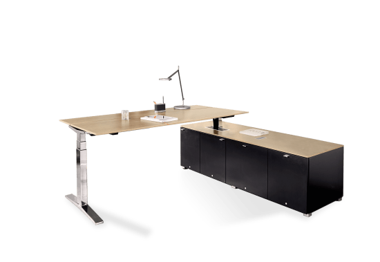 L'équipement pour un bureau de management statutaire. Avec TABLE.MANAGEMENT, qui offre un réglage en hauteur motorisé avec le pied en T et est donc idéal pour un poste de travail en mouvement, même après une longue et dure journée de travail, votre dos n'est pas surmené. L'unité comprenant le système de table, le caisson technique et le sideboard est à la fois élégante et fonctionnelle.