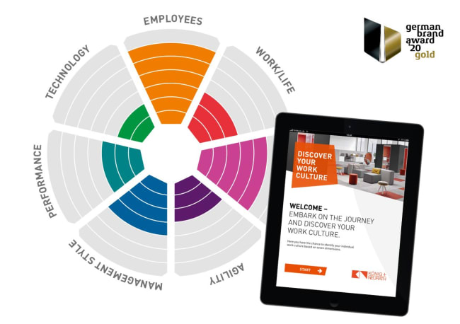 Elk bedrijf heeft zijn eigen, unieke arbeidscultuur. Met de analysetool K+N WORK.CULTURE.MAP kunnen wij de mogelijkheden van de individuele arbeidscultuur van onze klanten visualiseren en hieruit ideeën distilleren voor de inrichting van de werkomgeving. Wij zijn erg blij dat deze adviestool de prominente jury van de German Brand Award in de categorie “Excellence in Brand Strategy and Creation – Brand Communication – Collaboration” heeft kunnen overtuigen, en dat hij de gouden onderscheiding in de wacht heeft gesleept. Viktoria König, verantwoordelijk voor de verschijningsvorm van het merk en de toepassing ervan, verheugt zich over de motivering van de jury. Een nieuwe digitale tool, die te midden van de concurrentie ongetwijfeld uniek is, die König + Neurath als totaalaanbieder resp. procesbegeleider onderscheidt en de overgang naar een klantgericht merk in de dagelijkse praktijk op toonaangevende wijze promoot.”